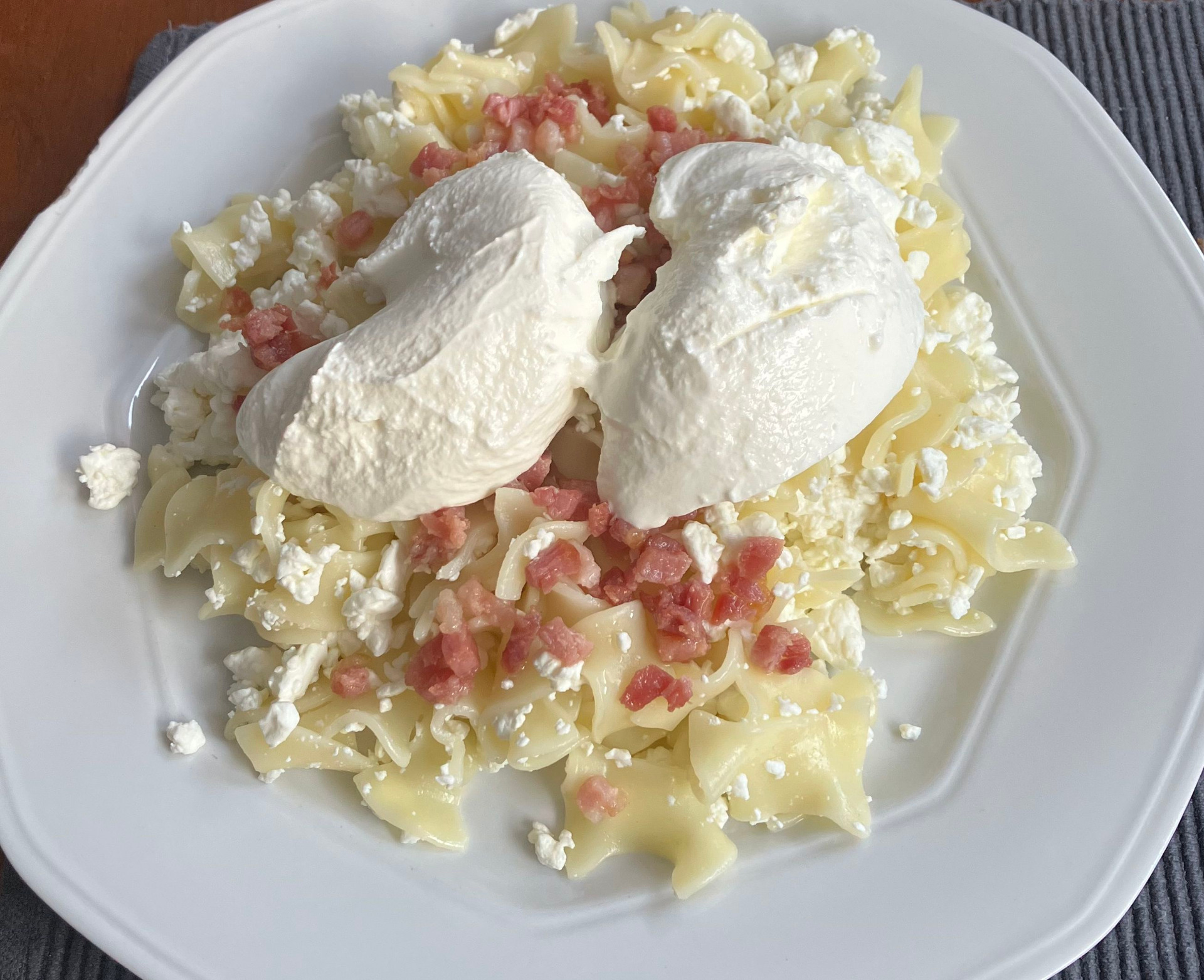Túrós tészta pirított baconnal, tejföllel és porcukorral